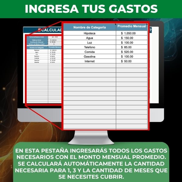 ✅ 1. GASTOS DE VIDA ESENCIALES: enumera todos tus gastos mensuales esenciales y el gasto mensual promedio para cada uno. ¡Calculará automáticamente tu meta de fondo de emergencia!
